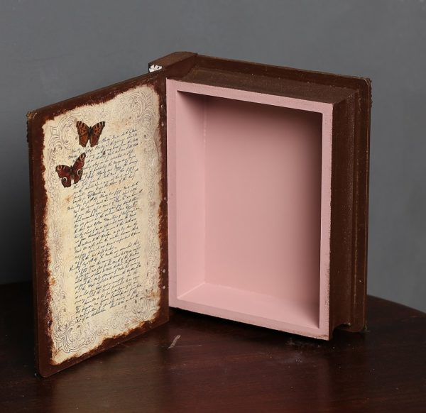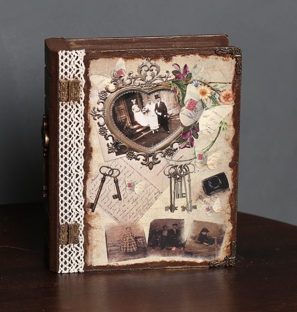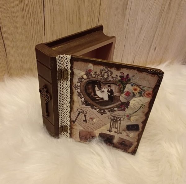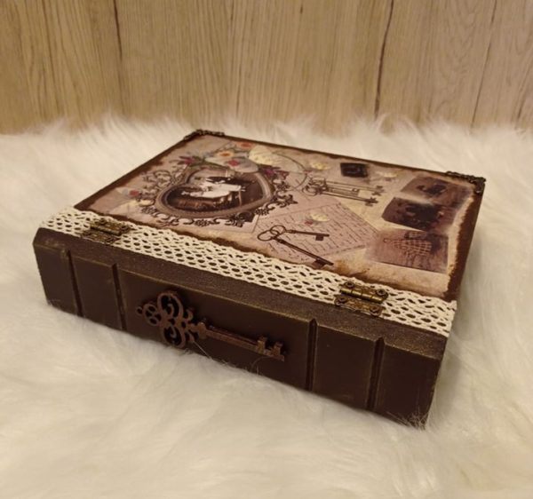 Used materials: MDF box, rice paper, paste, antique-effect paint, laces, matt lacquer.