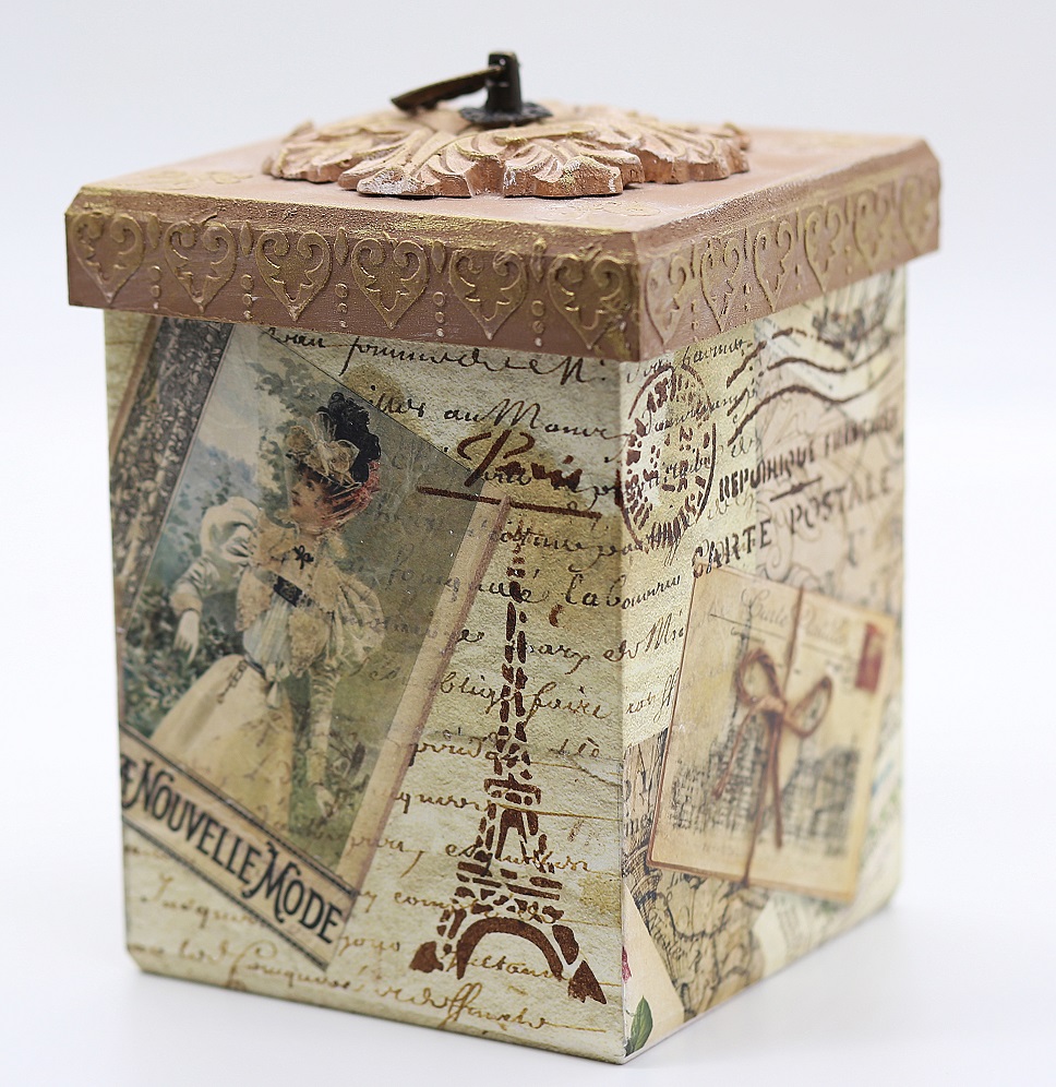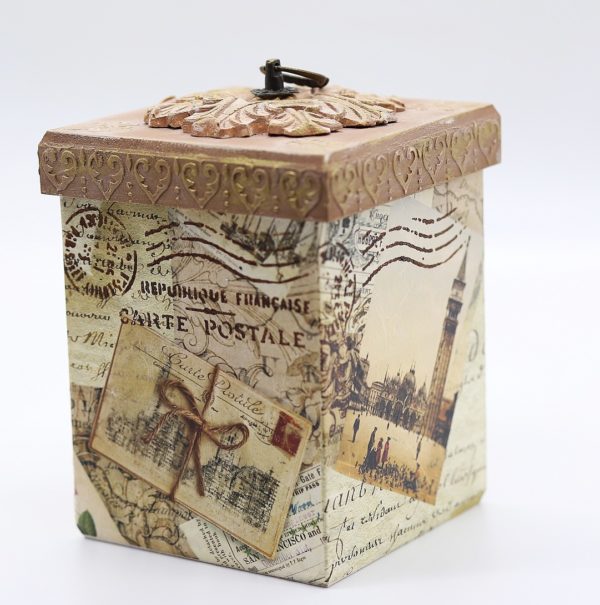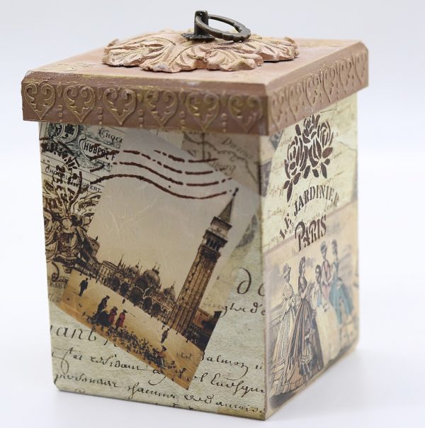 Used materials: MDF box, rice paper, chalk paing, acrylic paint, paste, synthetic resin, metal handle.