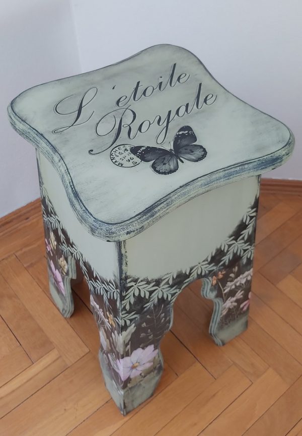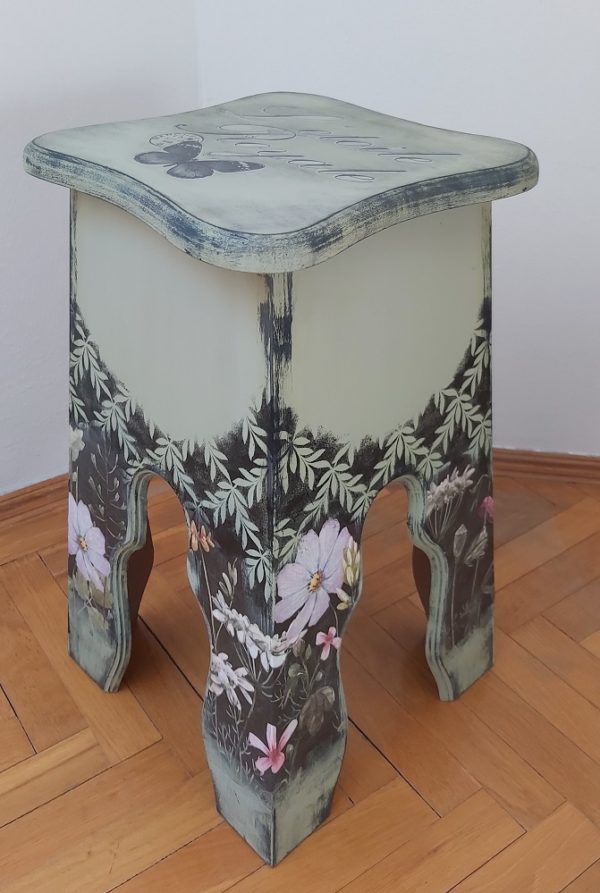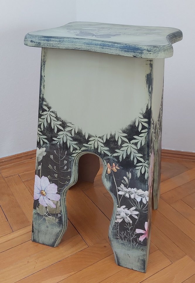 Used materials: MDF stool, rice paper, chalk paint, acrylic paint, antique-effect paint.