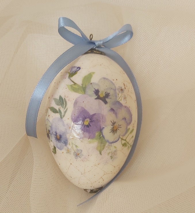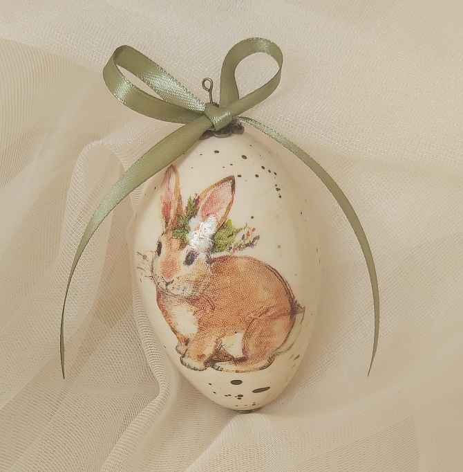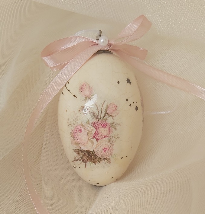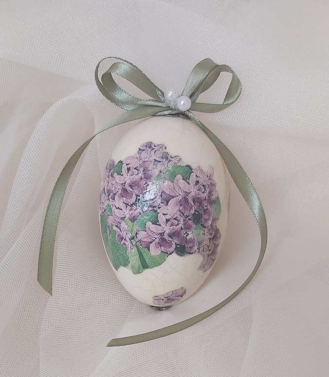 Felhasznált anyagok: kifújt lúdtojás, akrilfesték, szalvéta, repesztő, lakk, szalag, gyöngykupak.