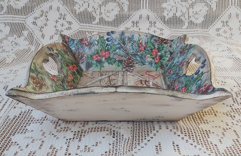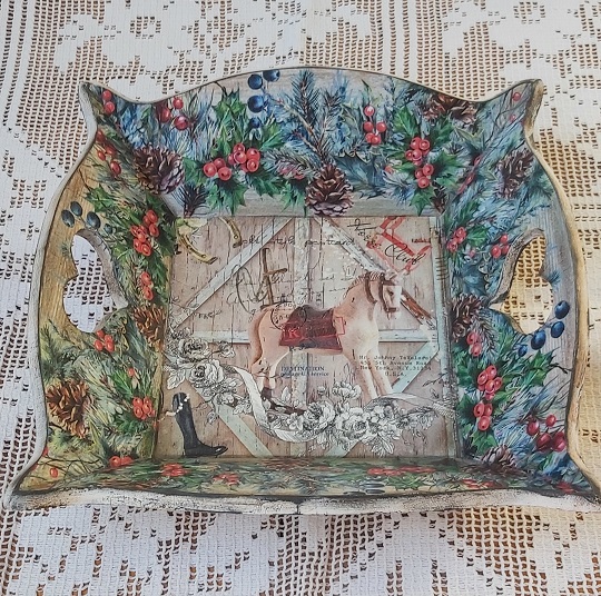 Felhasznált anyagok: MDF tálca, rizspapír, paszta, akril és krétafesték, matt lakk.