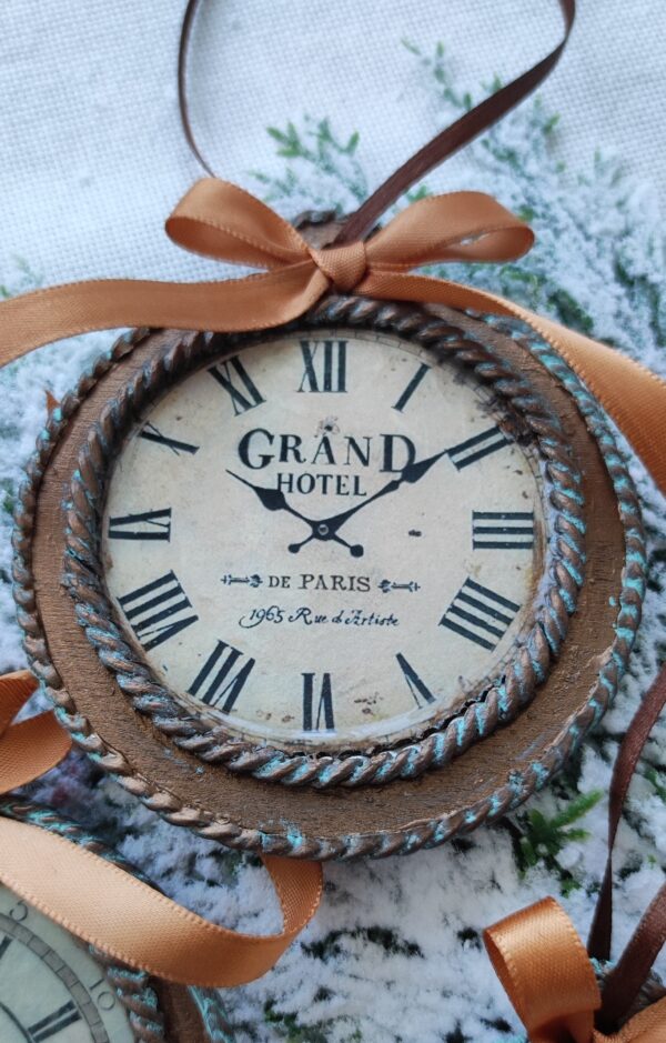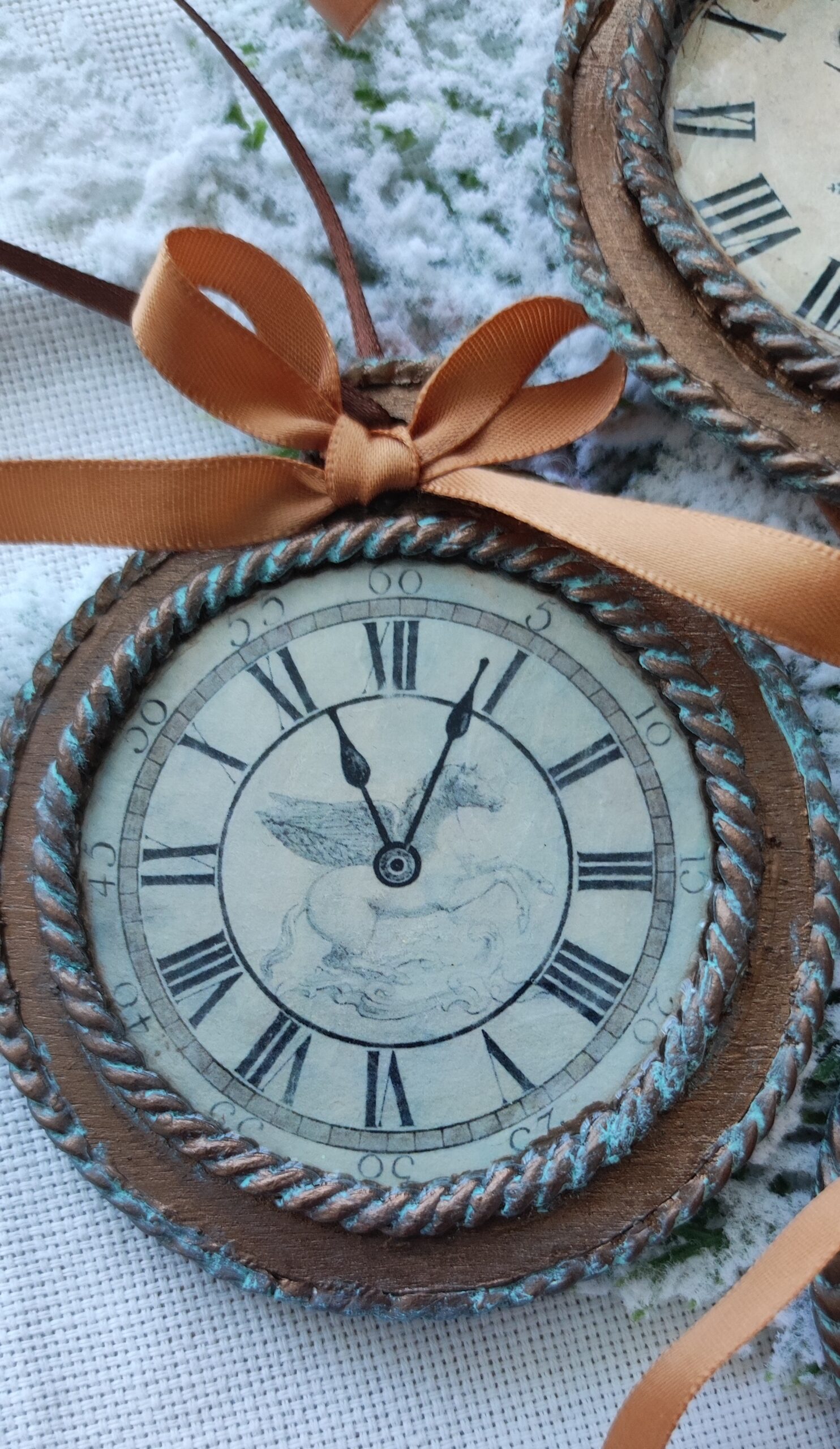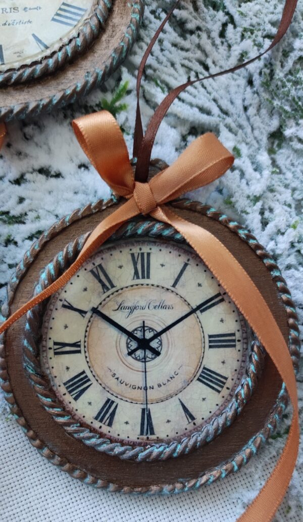 Felhasznált anyagok: fa kördísz, rizspapír, paszta, prémium festék, gyurma, szalagok.