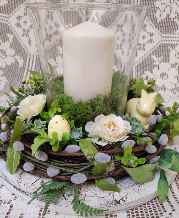 Antikolt MDF alapra készült tavaszi asztaldísz nagyméretű gyertyával.