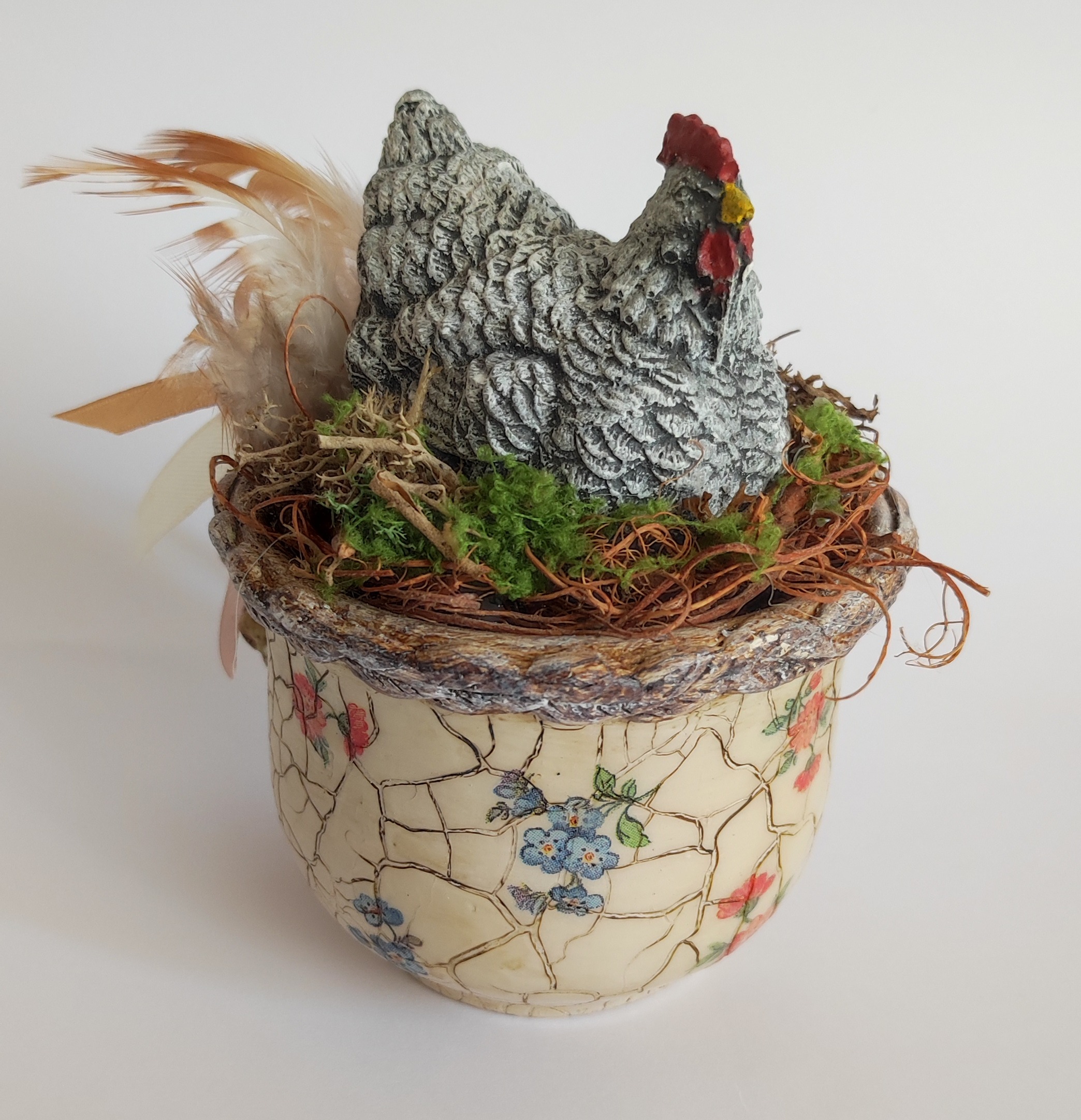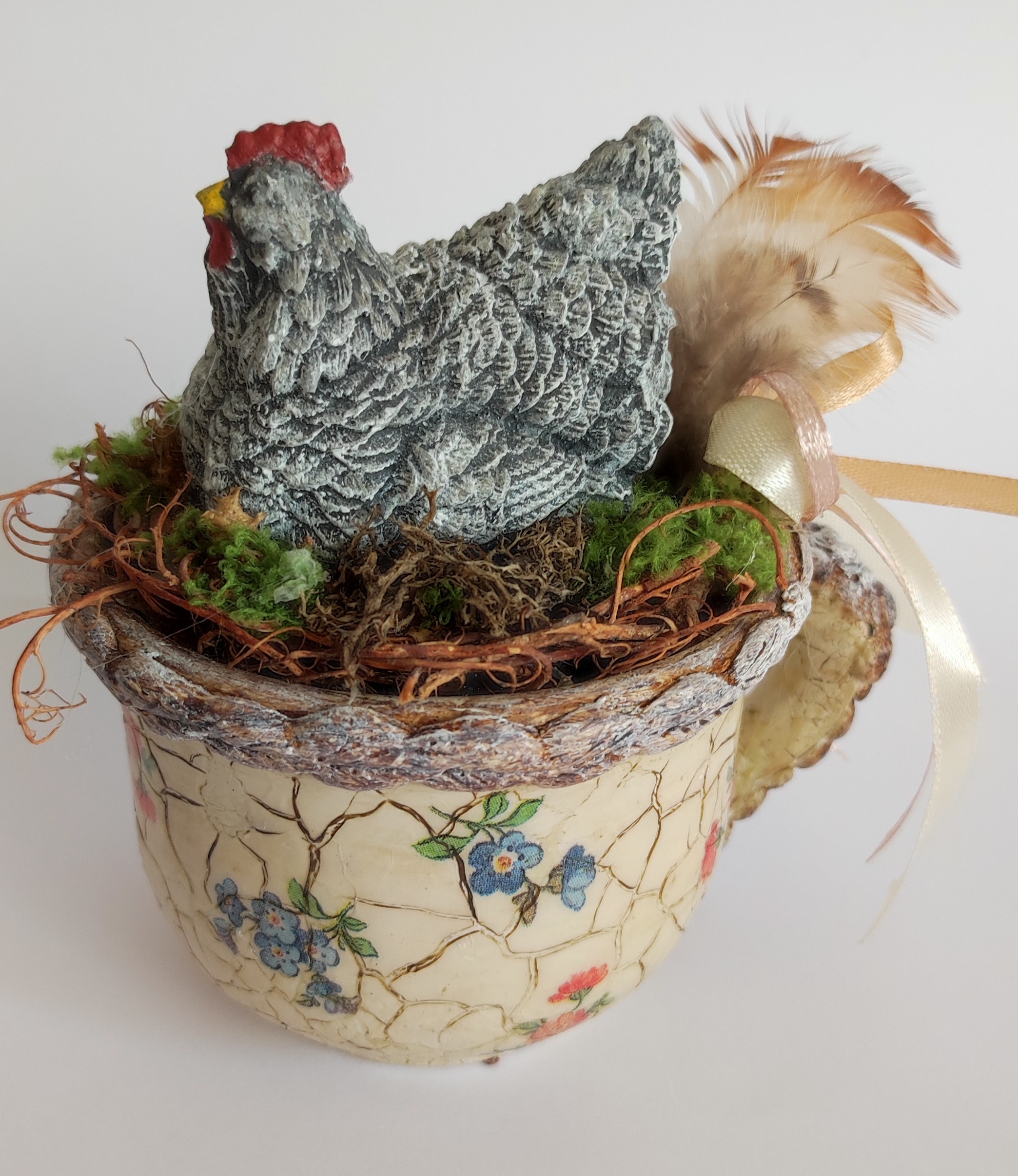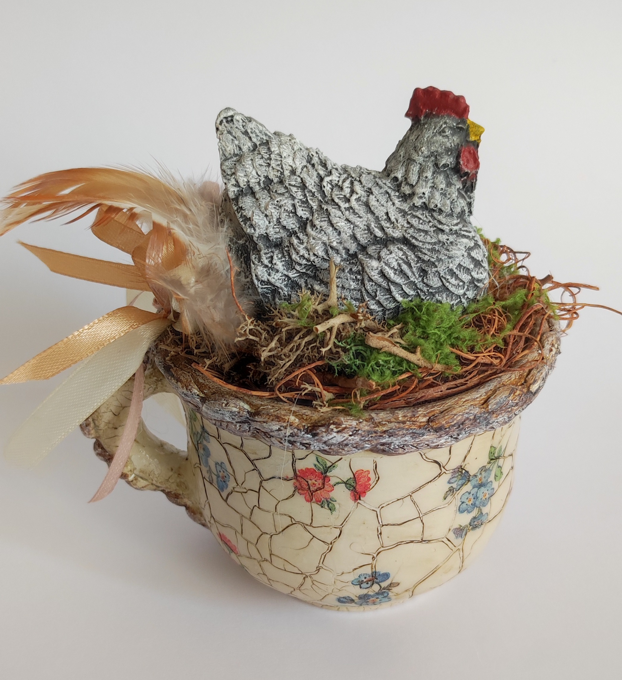 Felhasznált anyagok: kerámi bögre, kerámia tyúk, művirágok, műmoha, akrilfesték, repesztő